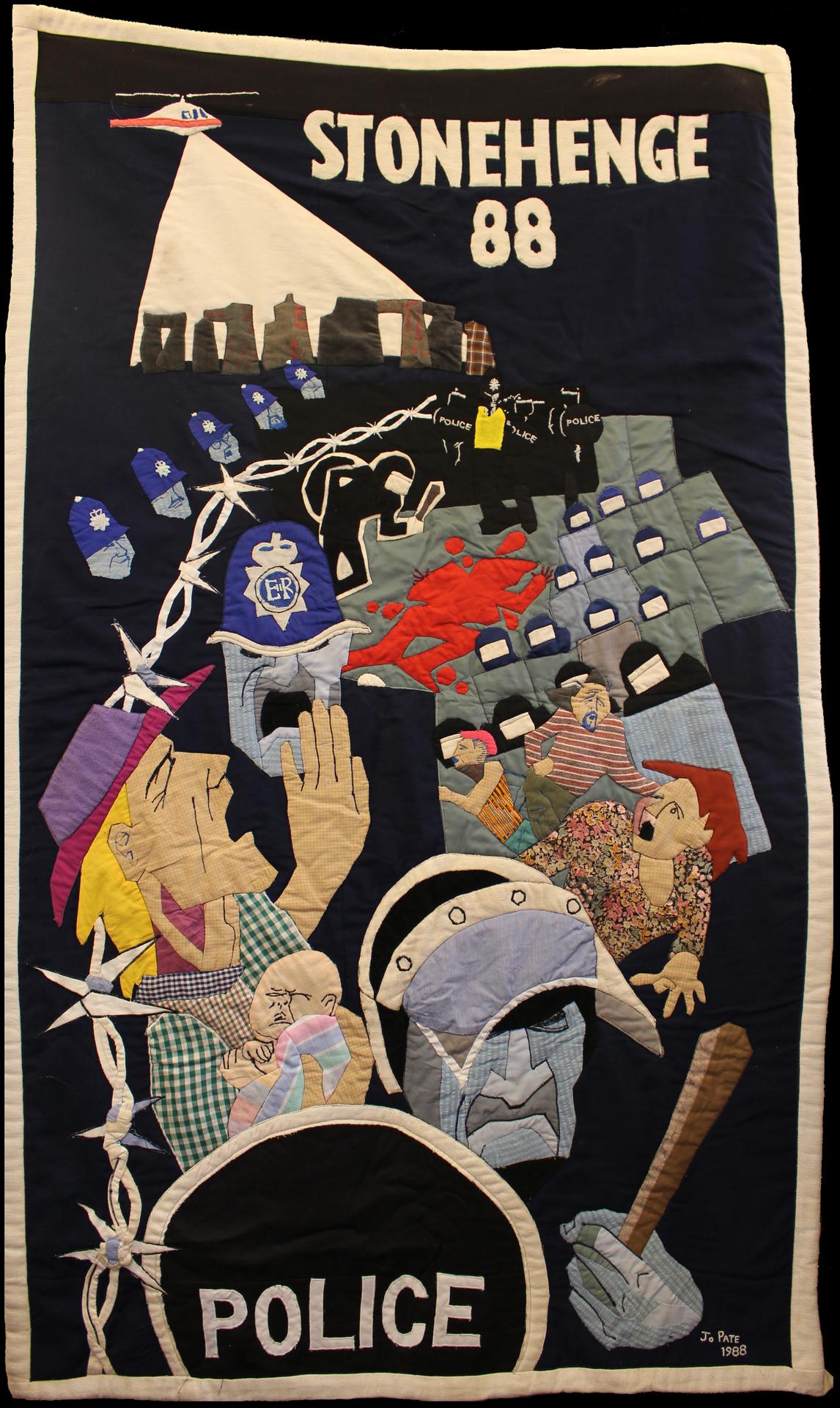 This hand-made banner references the way that the British State treated members of the ‘Peace Convoy’ throughout the 1980s. The Stonehenge Free Festival took place around the time of the summer solstice for over a decade, attracting up to 100,000 people.