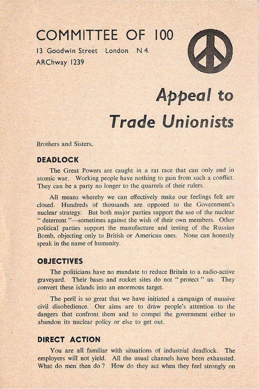 Appeal to Trade Unionists, Committee of 100, leaflet, early 1960s, MayDay Rooms Archive