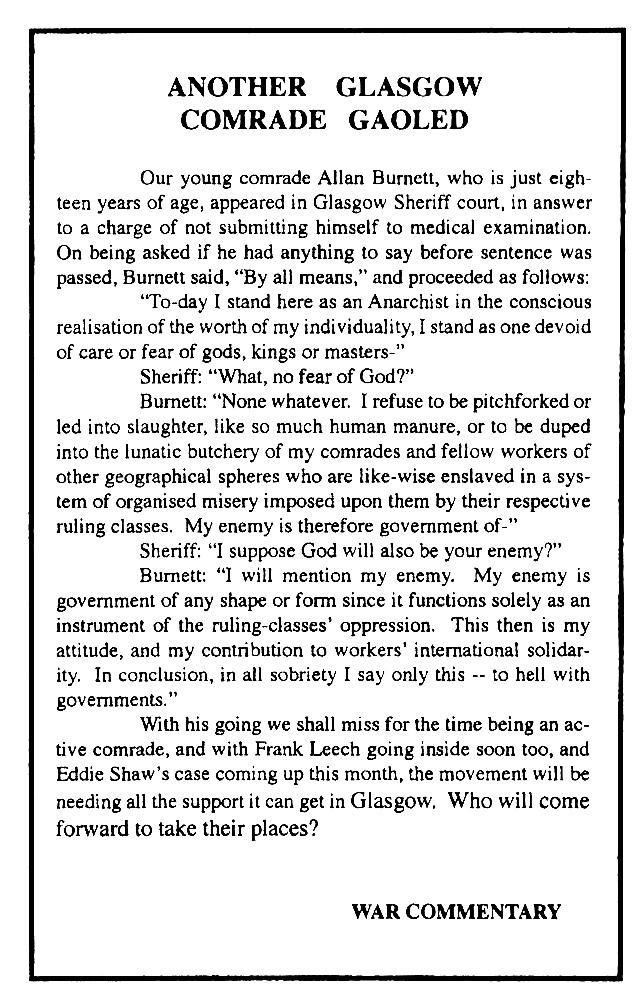 Another Glasgow Comrade Gaoled War Commentary 1943, Newspaper clipping (published by Freedom Press, London), Spirit of Revolt Archive