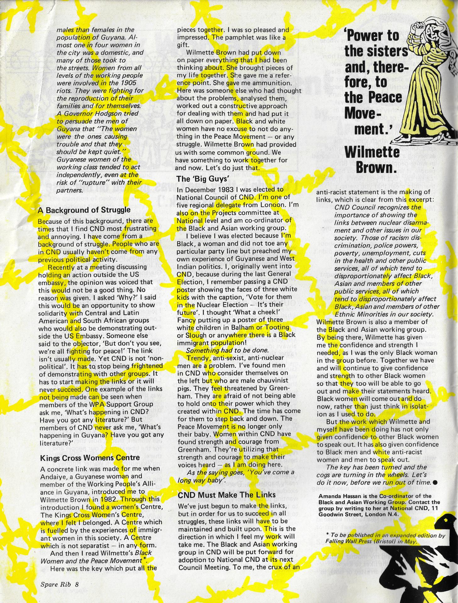 A Black Woman in the Peace Movement (from Spare Rib, no.158), September 1985, Newspaper article, p1 & 2, May Day Rooms Archive