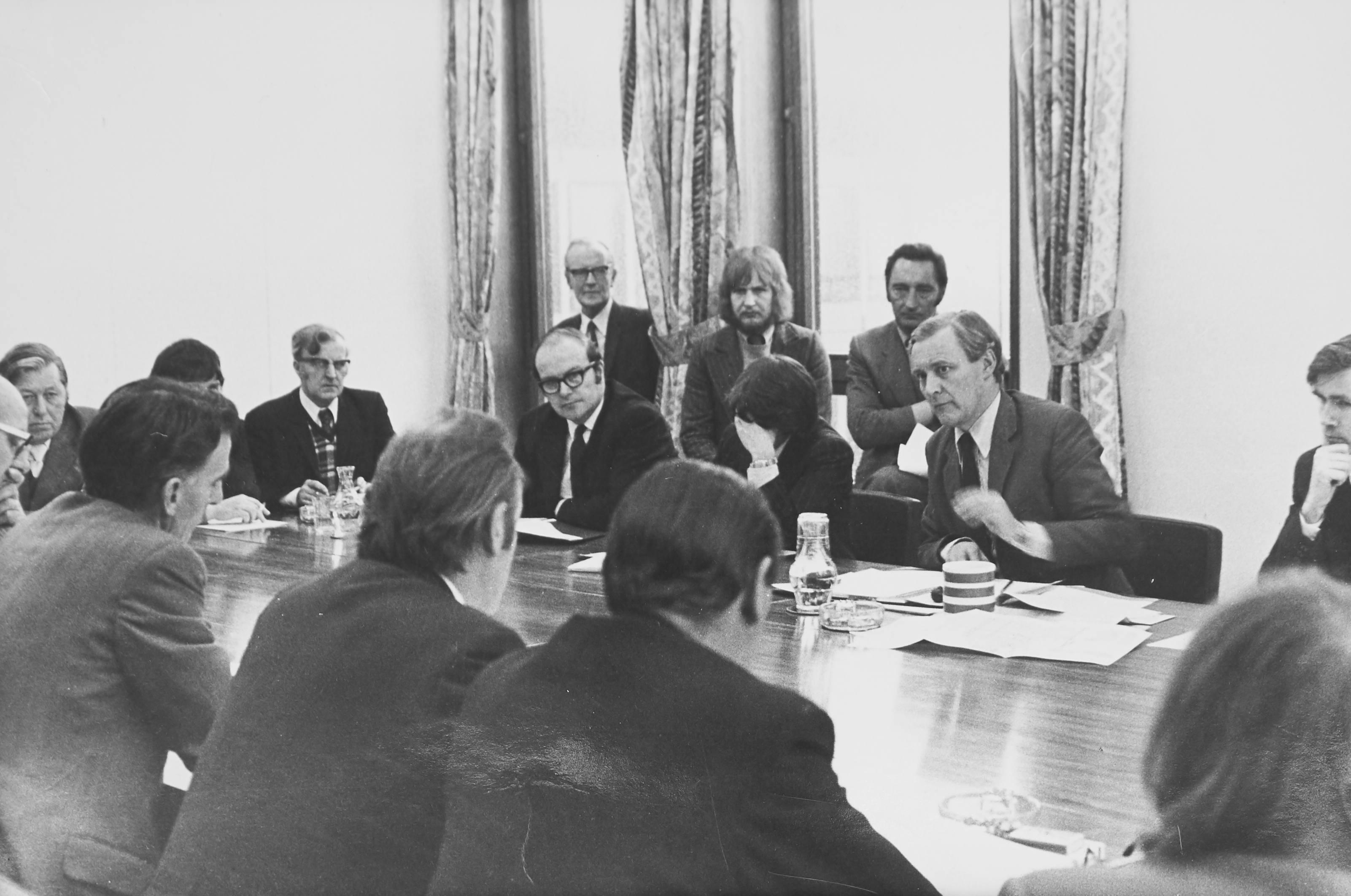 Photo of Lucas Plan Workers meeting with Tony Benn Circa 1974, B&W photograph, MayDay Rooms Archive