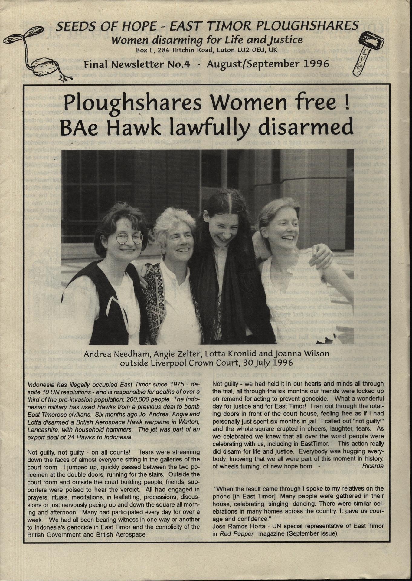 In the early hours of 29 January 1996, a group of women — Jo Blackman, Lotta Kronlid, Andrea Needham, and Angie Zelter, with vital support from six others — broke into a British Aerospace factory in Warton, Lancashire.Their target was a Hawk fighter jet bound for Indonesia, a country that was waging a genocidal campaign of mass killings and brutal repression in East Timor, resulting in the imprisonment, torture, and death of a third of its population. The genocide was facilitated by a lucrative trade in armaments with the British government.
