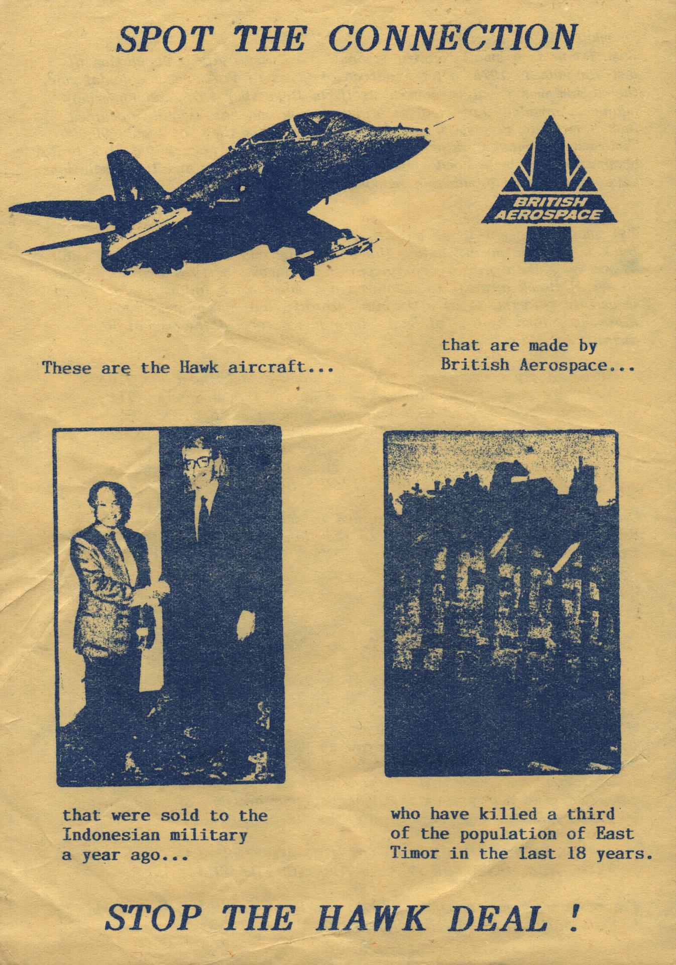 After months of planning, the women cut a hole in the factory’s perimeter fence and located the jet that was due to be sold to the Indonesian Air Force. Using household hammers, they pounded away at its airframe and weapons systems, laid photographs of Timorese children on the wingtips, and sprinkled flowers and vegetable seeds around its wheels. They also left a pamphlet and VHS tape in the cockpit containing their recorded confessions — as well as an indictment of British Aerospace and the UK government for conspiring to breach the 1861 Offences Against the Person Act and 1969 Genocide Act — thereby ensuring it would become part of the ‘crime’ scene and be entered into evidence. In addition to their own testimonies, the videotape contained documentation of the 1991 Santa Cruz Massacre of more than 250 peaceful protesters in Dili, and a British Aerospace sales advertisement as evidence of the so-called ‘trainer’ jet’s offensive capabilities.