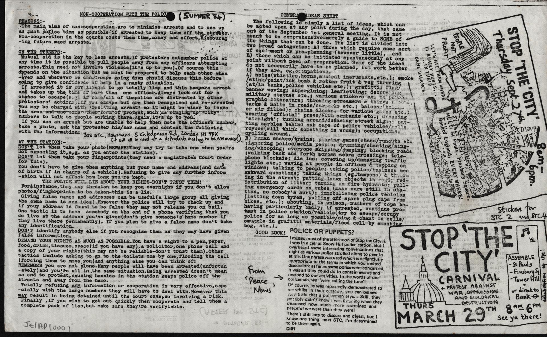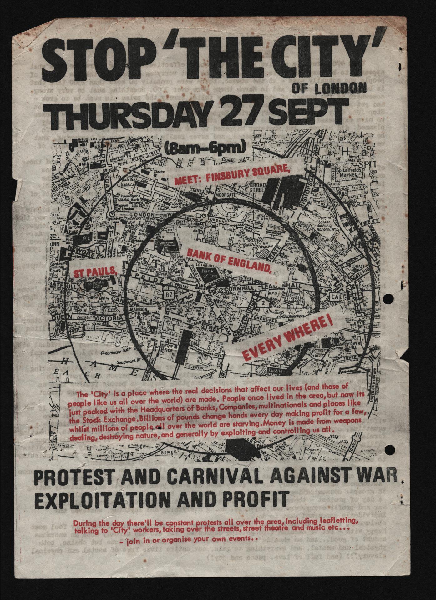 Front: Stop The City leaflet, August/September 1984, MayDay Rooms Archive