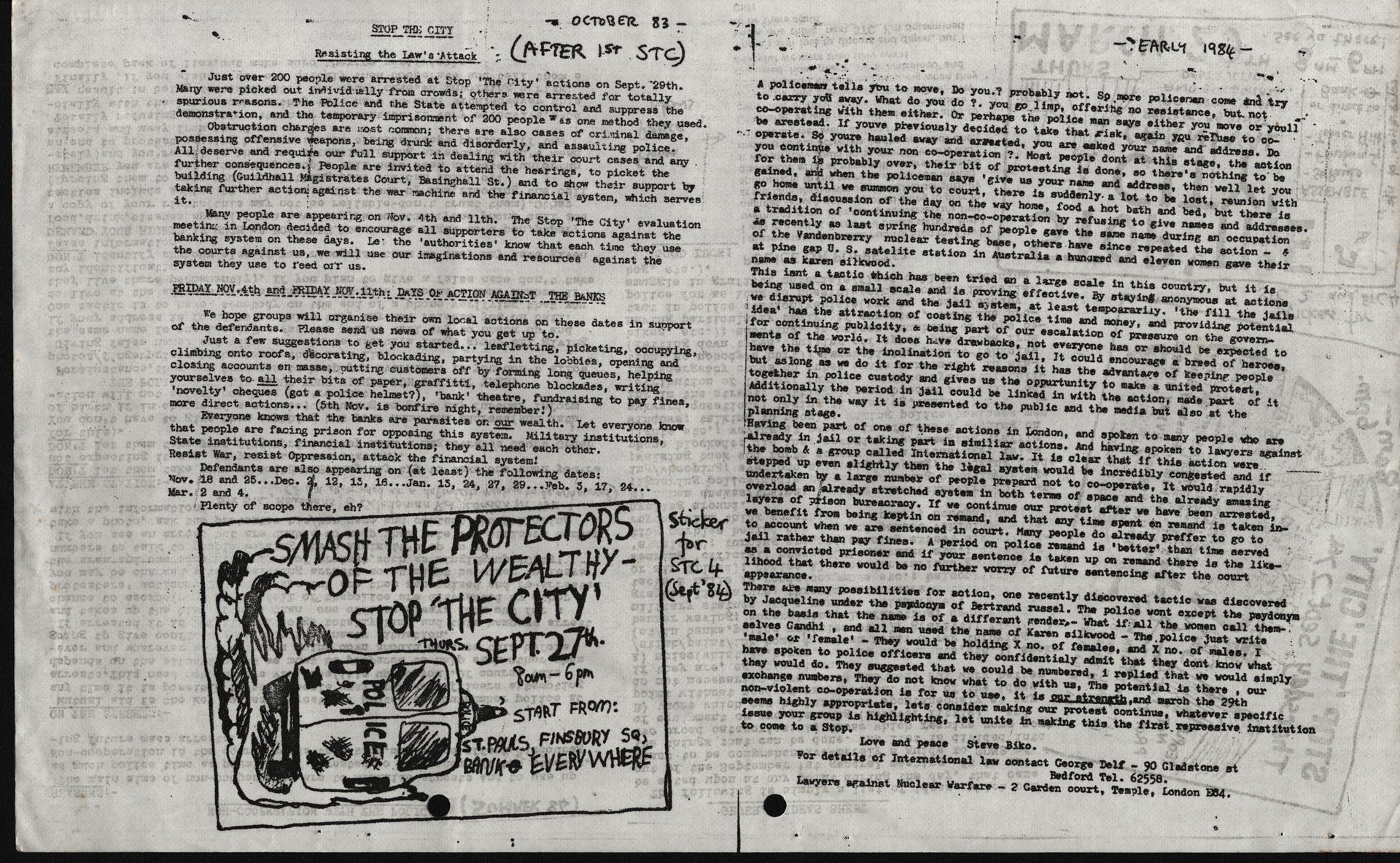 The Stop the City action was billed as a 'Carnival Against War, Oppression and Destruction' which challenged the root cause of all their problems - Capital. It consisted of four separate day-long street blockades of London's financial district between 1983- 1984. One blockade involved 3,000 people and succeeded in causing a significant shortfall in City trading. The actions were not led by a single organisation, though London Greenpeace played a role in initiating the campaign.