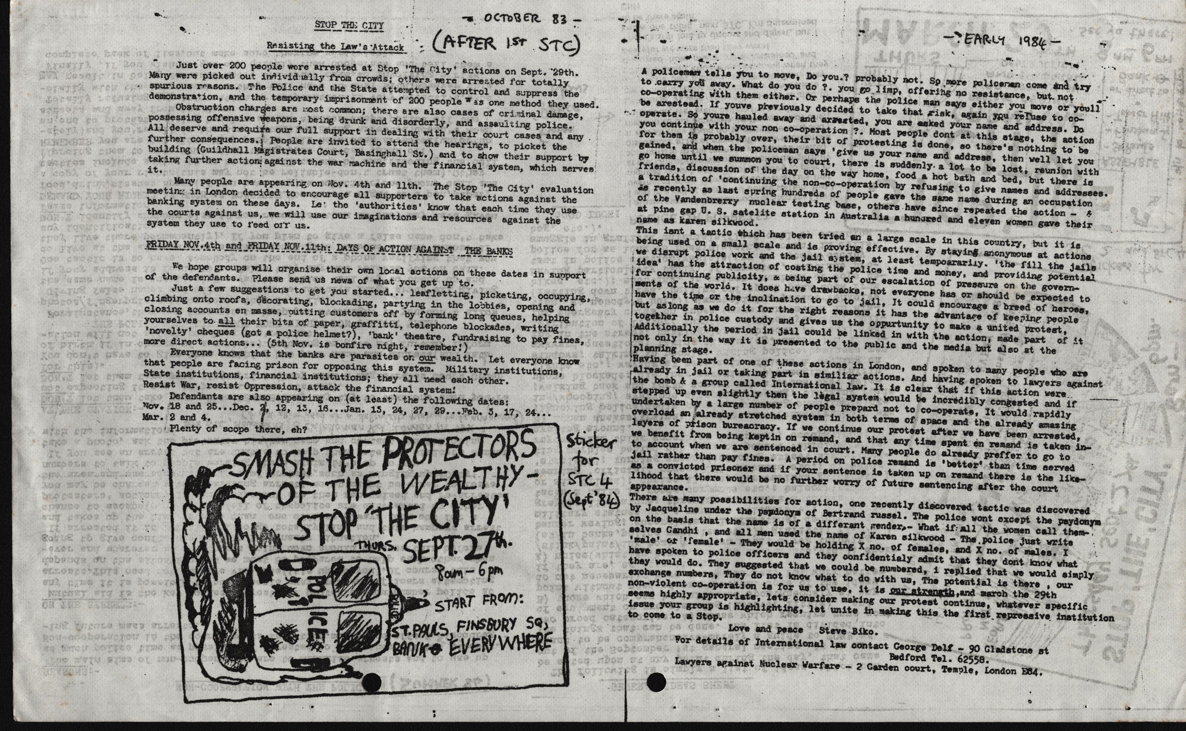 Back: Stop The City leaflet, August/September 1984, MayDay Rooms Archive