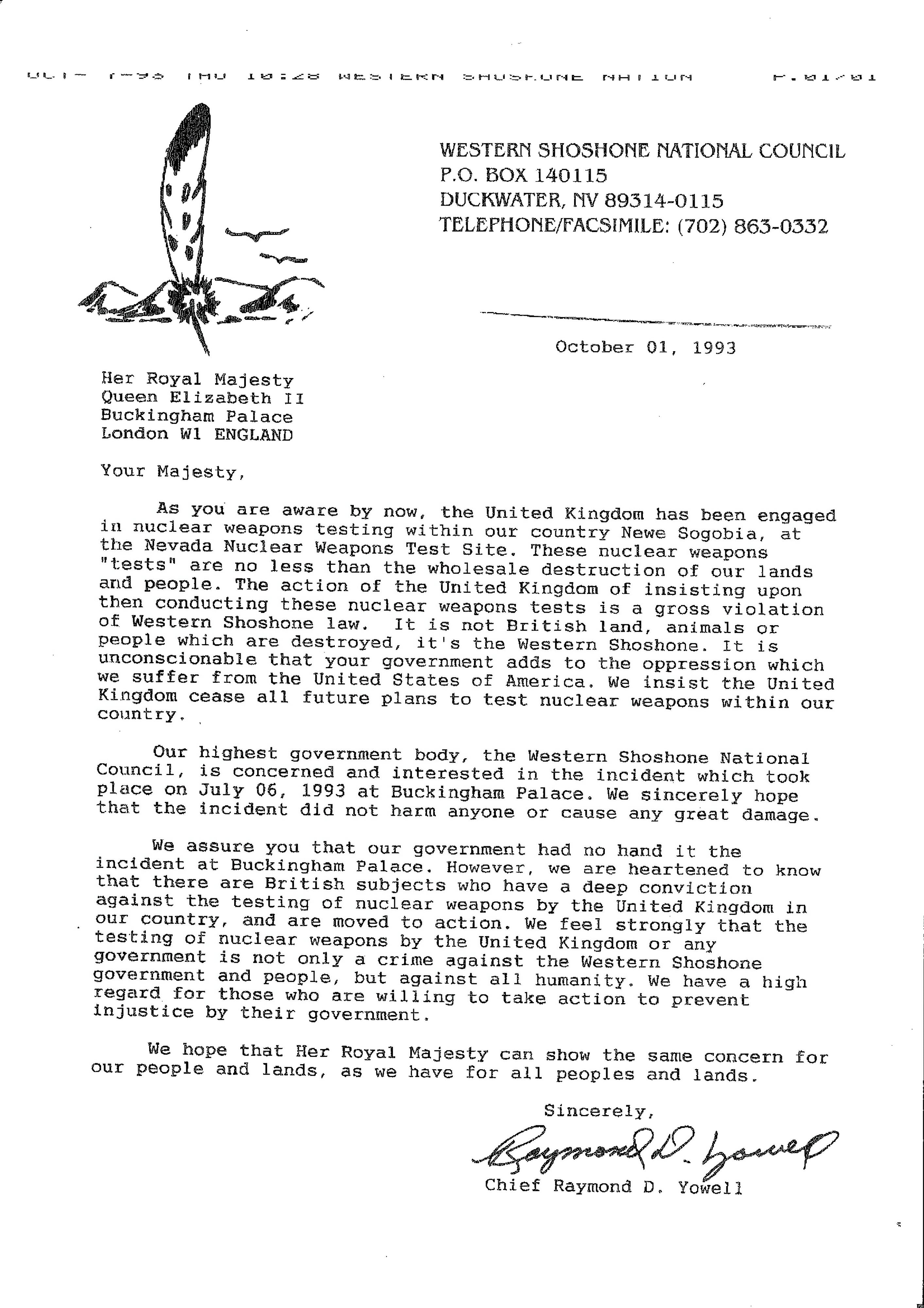 Letter to Queen Elizabeth II from Chief Raymond D. Yowell Western Shoshone National Council for trial of UK women arrested at Buckingham Palace 1993, Glasgow Women’s Library Archive