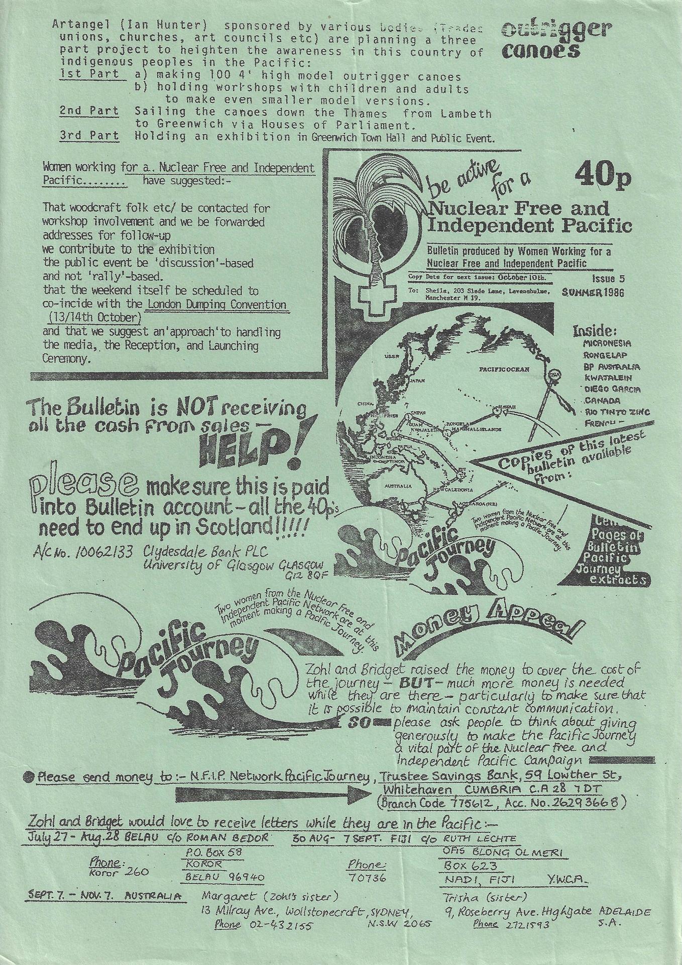 As the network grew, it organised and hosted several speaking tours across Britain of women from the Pacific, publishing their speeches in a pamphlet ‘Pacific Women Speak – Why Haven’t You Known?’. The network also supported British-based women visiting the Pacific and organised a wide range of protests, as well as regular gatherings in different British cities. Most of these activities, along with active participation in the network, dwindled in the 1990s. However, the group continued to publish a newsletter right up until 1999, distributed by post throughout Britain.