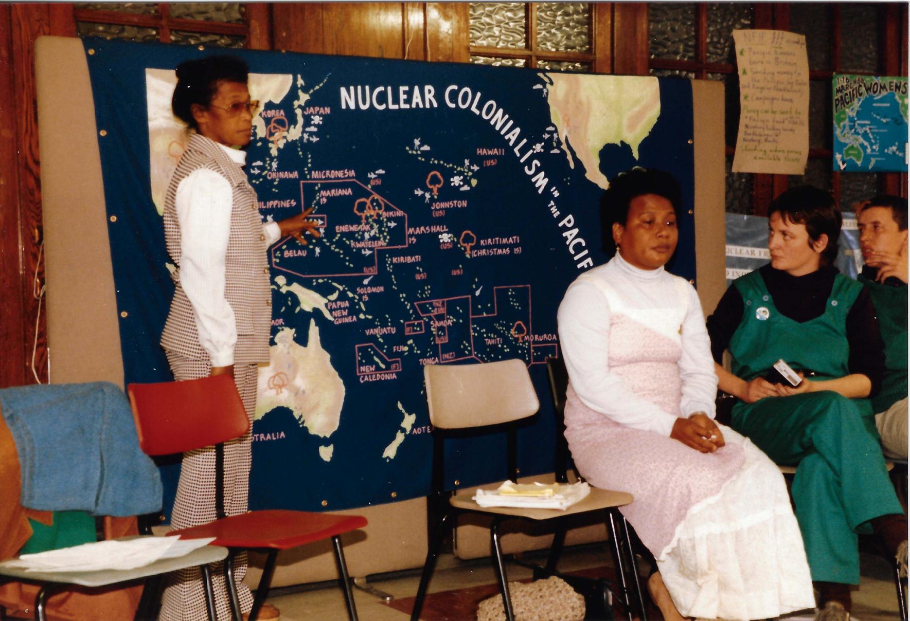 Women for a Nuclear Free and Independent Pacific emerged from a party held at Greenham on 1st March 1984 to celebrate the resilience of Marshallese survivors of nuclear testing. The group became one of several networks in Europe formed in solidarity with the indigenous-led movement launched in Fiji in 1975. Women for a Nuclear Free and Independent Pacific aimed to raise awareness of the impact of British, US, and French nuclear colonialism in the Pacific, while also providing a platform for Pacific women to speak for themselves and their people.