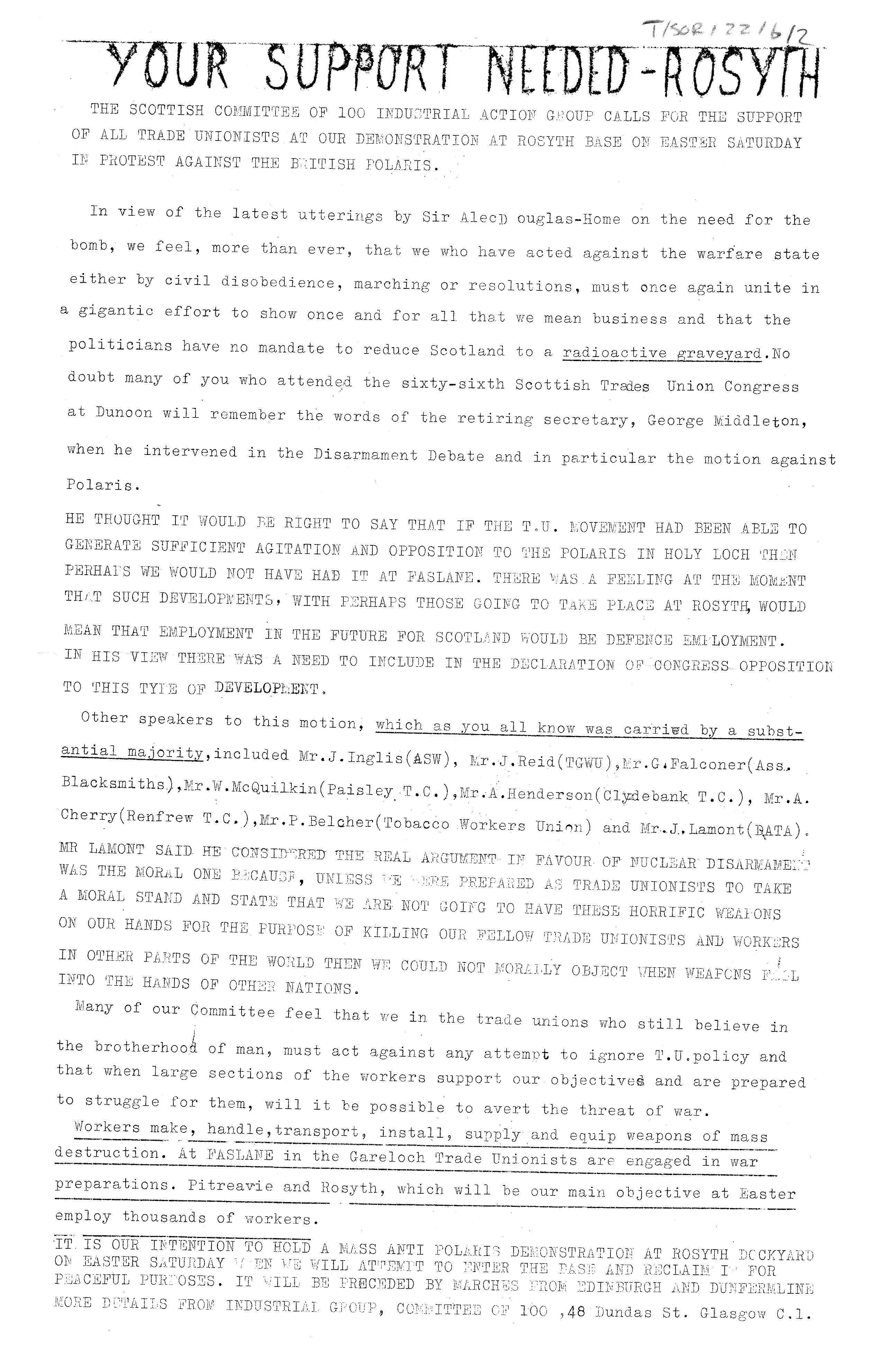 Your Support Needed - Rosyth Scottish Committee of 100, 1964, Leaflet, Spirit of Revolt Archive